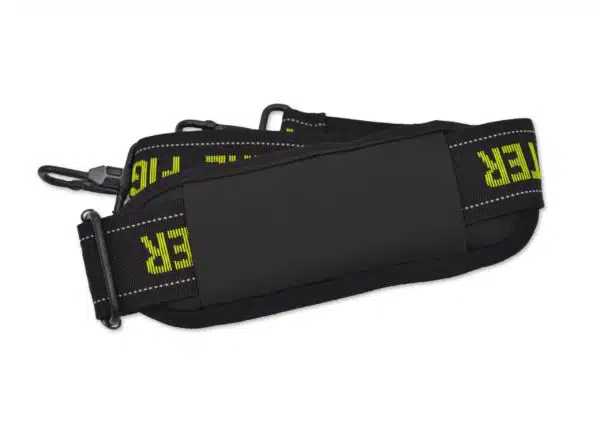 The bag includes a nylon webbing hang-tab and chrome snap hook for easy mounting options. The front is designed with a fireman’s maltese cross logo and yellow-silver reflective trip with leather reinforcement. The main hold of is designed to be expandable so that it can accomodate many different styles of respirators and masks.
