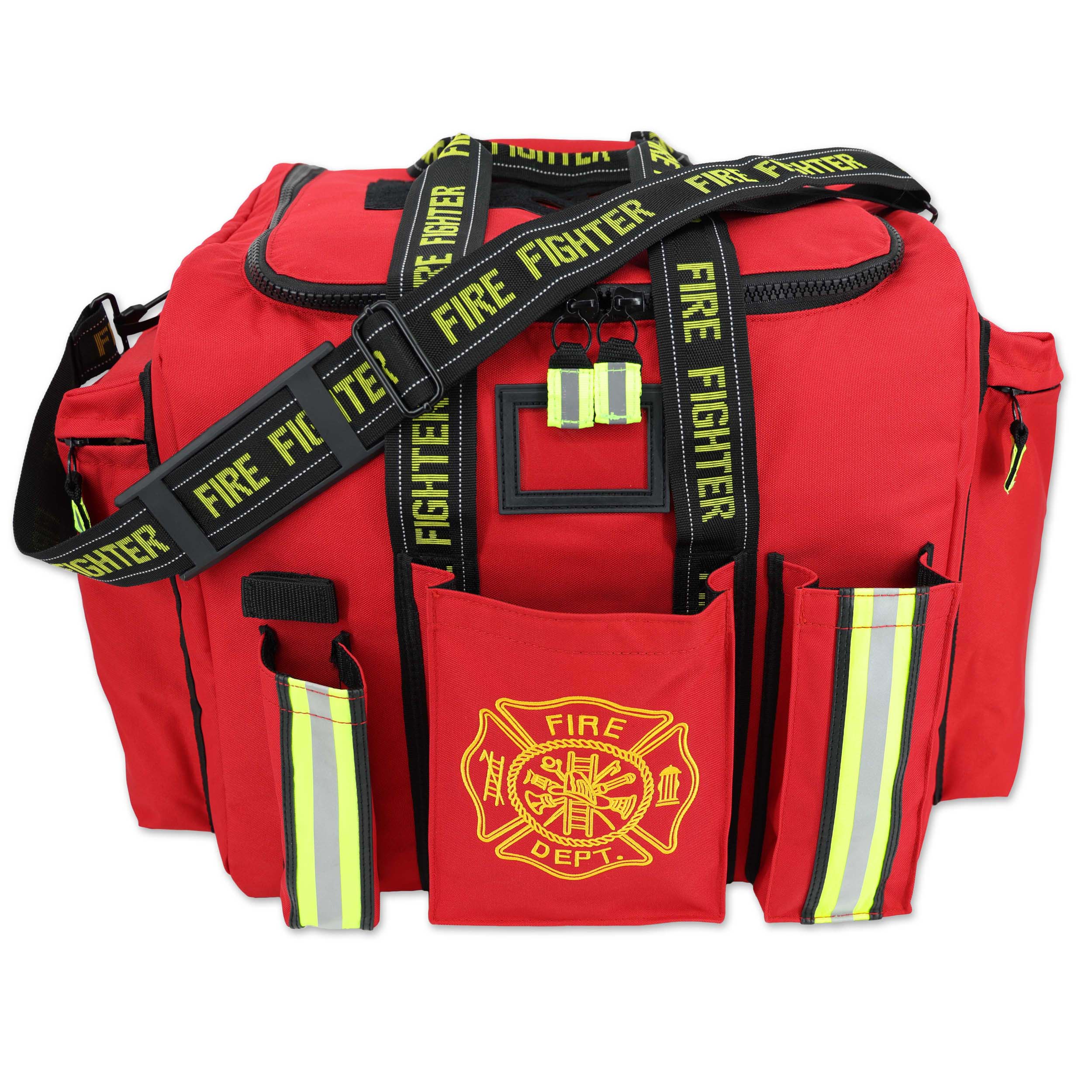 Built for visibility and durability, this firefighter duffel features high-visibility fluorescent trim, reflective striping, and integrated reflective webbing for added safety on scene. The reinforced PVC bottom helps protect against water, abrasion, and wear, while the embroidered Maltese cross logo delivers a professional look that won’t fade over time. With optional customization available, this bag is also a great personalized gift for any first responder.