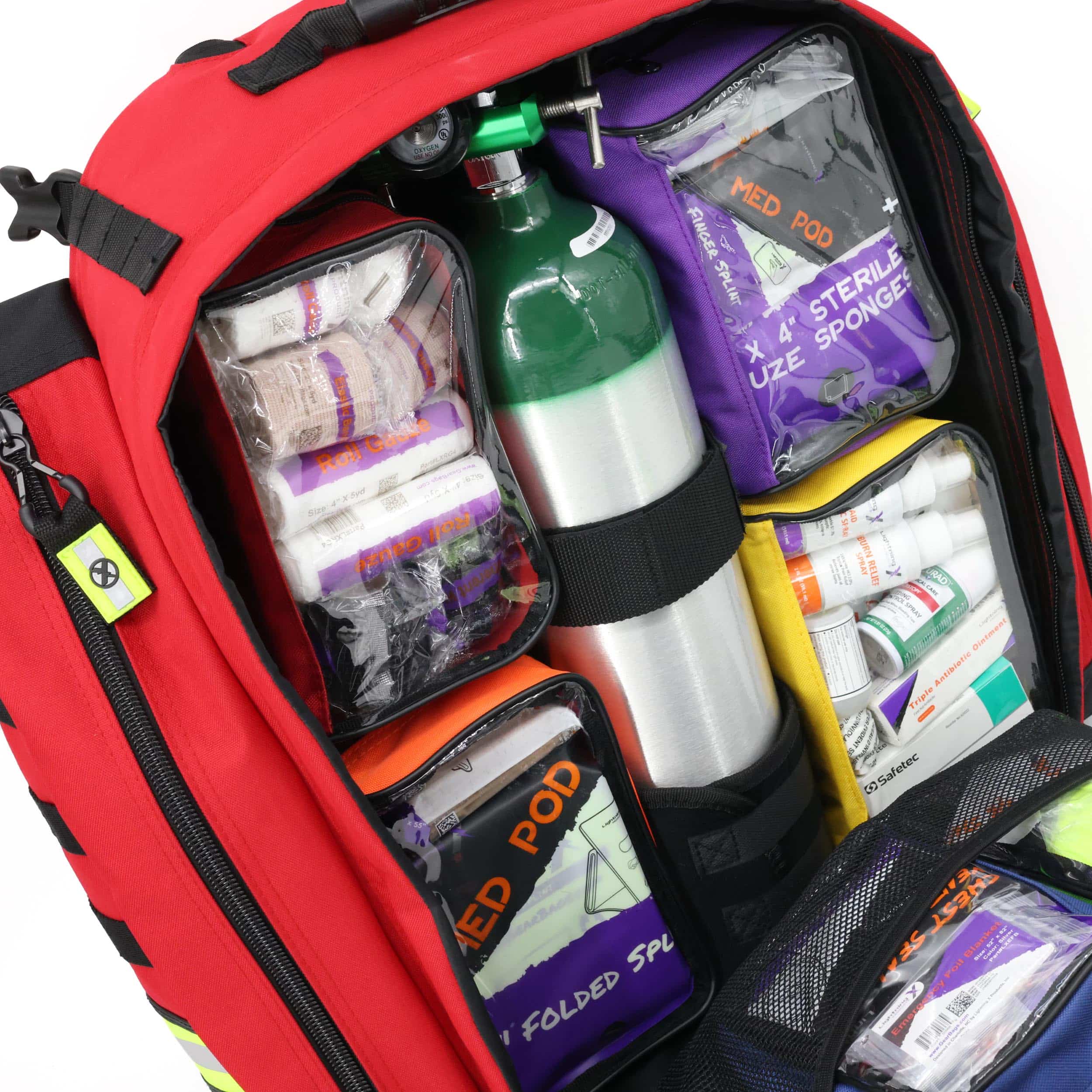 - Fully Stocked with Professional-Grade Supplies – Comes loaded with trauma dressings, airway kit, cylinder + regulator, BP cuff, stethoscope, tourniquet, burn care, splints, bandages, gloves, and more—ideal for EMS, fire, rescue, and disaster response.