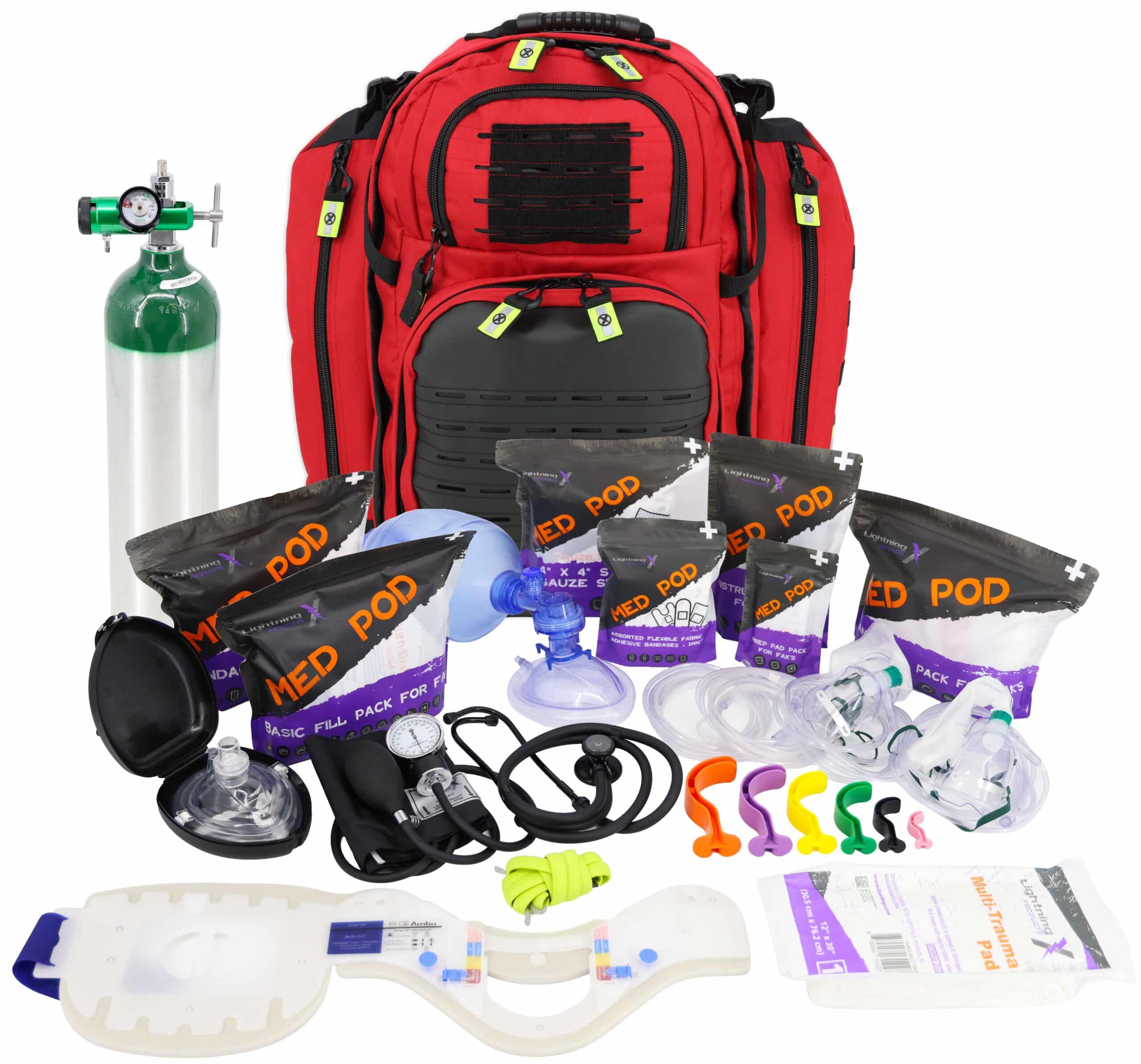 - Tweezers • Kelly Hemostats • 7.5″ Trauma Sheers • Bandage Sheers • LED Penlight • Ammonia Ampules x 10 • Heavy-Duty Fabric Adhesive Bandages x 100 assorted sizes • 4″ x 4″ Gauze Pads x 50 • 2″ Roll Gauze x 2 • 3″ Roll Gauze x 2 • 4″ Roll Gauze x 2 • 2″ Self-Adherent Bandage x 2 • 2″ Elastic Ace Bandage x 2 • 5″ x 9″ ABD Pad x 2 • 8″ x 10″ ABD Pad x 2 • 1″ Roll Cloth Tape • 2″ Roll Cloth Tape • Iodine Wipes x 10 • Isopropyl Alcohol Wipes x 10 • Triple Antibiotic Ointment 1/2 oz • Instant Cold Packs x 2 • Eye Pads x 2 • Triangle Bandage x 2 • Eye Wash 1oz • Nitrile Exam Gloves x 4 • Universal Finger Splint • Oral Glucose • Sting & Bite Relief Pads x 10 • Adult Blood Pressure Cuff • Sprague Rappaport Stethoscope • CPR Mask w/ Case • Berman Airway Kit x 6 Sizes • 10″ x 30″ Multi Trauma Dressing • Nasal Cannula Tubing x 2 • Non-Rebreather Mask x 2 • Adult Bag Valve Mask • 4-1/4″ x 36″ Universal Roll Splint • 6″ x 6″ Vented Chest Seal • Adjustable Cervical Extrication Collar • 2oz Burn Spray • 2oz First Aid Spray • Mylar Emergency Blanket • Quick Stop Hemostatic Blood Stop Spray • R.A.T.S Tourniquet • 4″ x 4″ Burn Dressing x 2 • Mini Oxygen Regulator 0-15 lpm • Med “D” Oxygen Cylinder (empty)