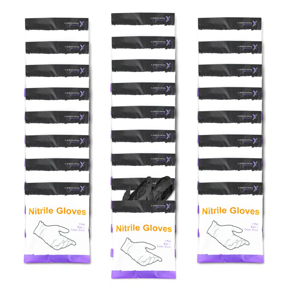 Lightning X medical grade Nitrile exam gloves – 25 packs of 1 pair (25 pairs, 50 gloves) individually packaged in resealable zippered poly bags. Smaller than a credit card and fits easily and unnoticeable in your pocket until you need them. Rugged Nitrile material is rip and puncture resistant and offers excellent dexterity, secure fit and ease of movement. The fingertips are lightly textured for a better grip. Our disposable nitrile gloves are ideal for those sensitive to rubber latex and deliver a comfort level rivaling that of latex. Great for first aid kits, stop the bleed kits, first responders, law enforcement, nurses, mechanics, food prep, custodians and more. Gloves are all size Large, which fit most users, and are considered food safe.